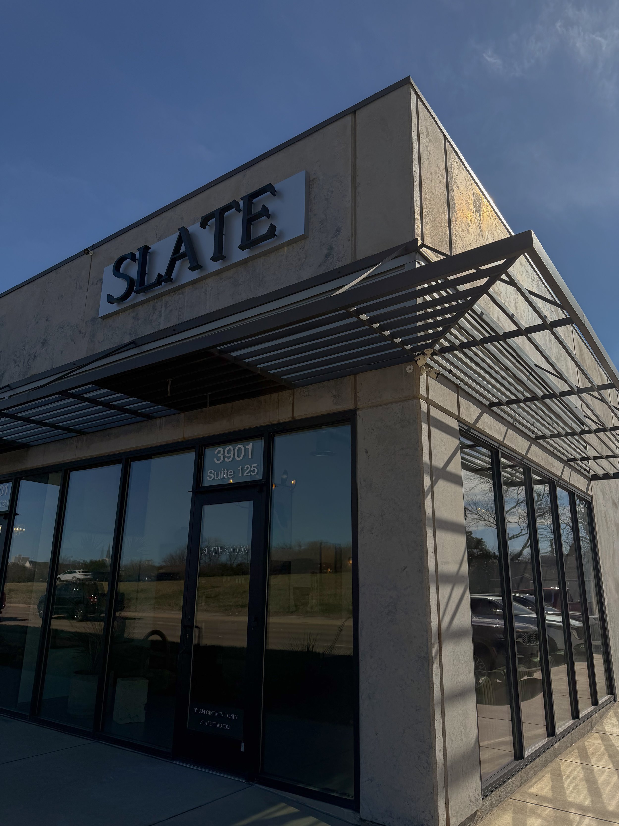I am located at Slate Salon. It is an intentionally curated salon to help keep your experience luxurious and relaxing. The address is 3901 West Fwy, Suite 125, Fort Worth, TX, 76107. When you arrive, you can park in either parking lot on each side of the building.